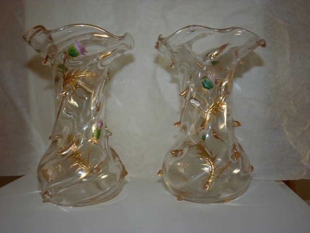 391 -- Crystal Pair vases with thorns and thistles gilded enamel Harrach
