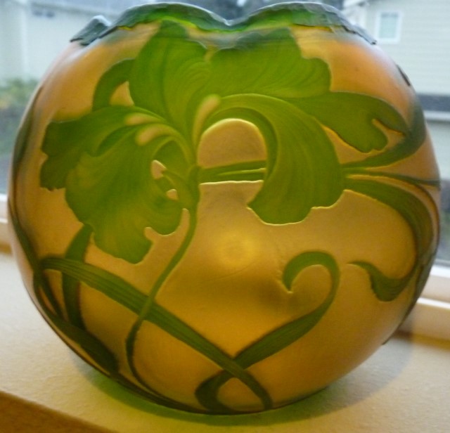 a Acid Cutback Cameo, Art nouveau Rose bowl, Floral in Citron and green. The design is most likely Julius Jelinek circa 1900, Harrach glass 6"x6"