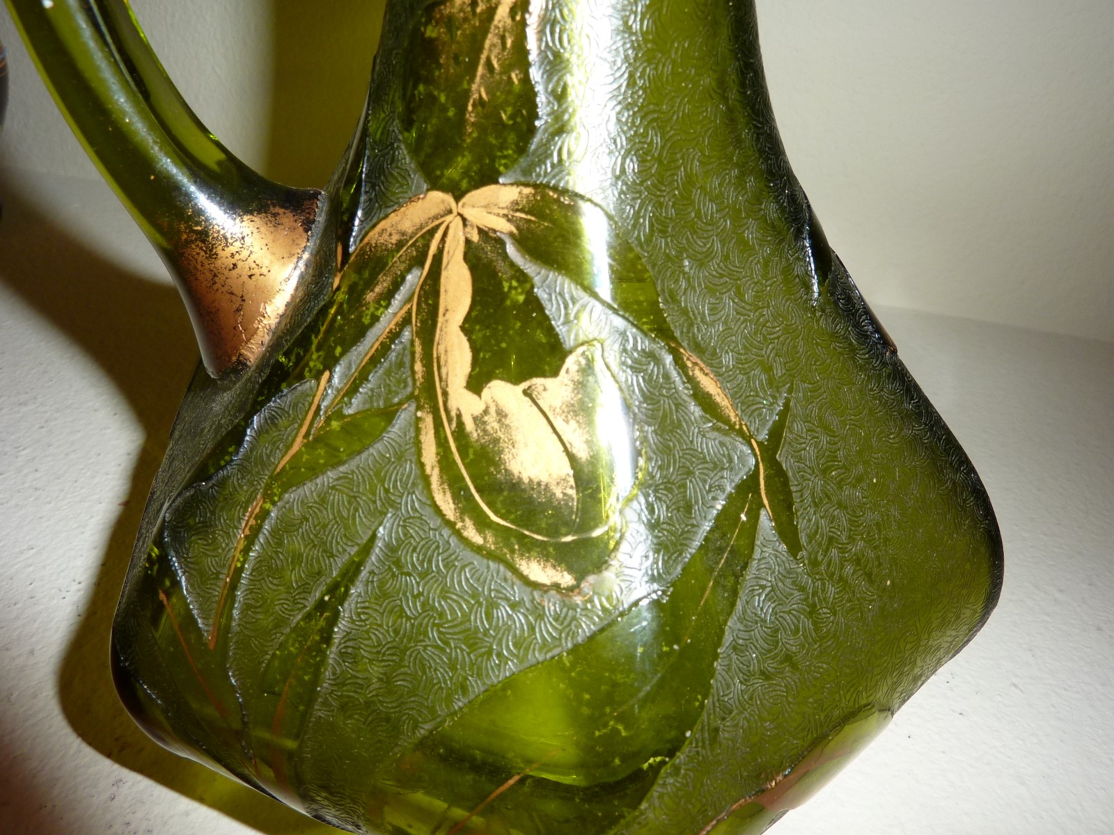 153 -- Acid cut back glass pitcher with stylized metallic rim. Gilded lilies