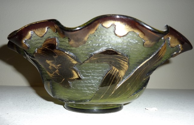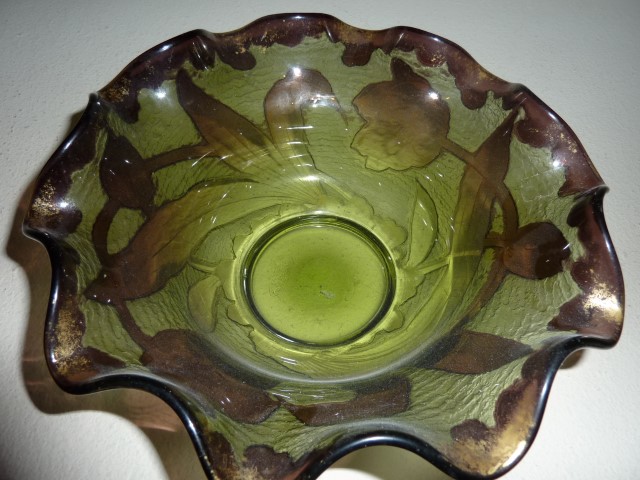 44 -- Green Moser glass Cameo bowl with iris and gilding