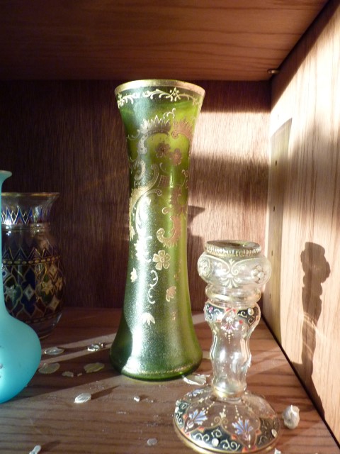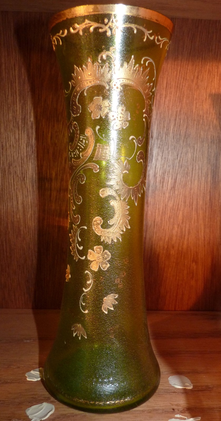 869 -- Green glass with gold dust and rococo enameling. Marked Moser to the side.