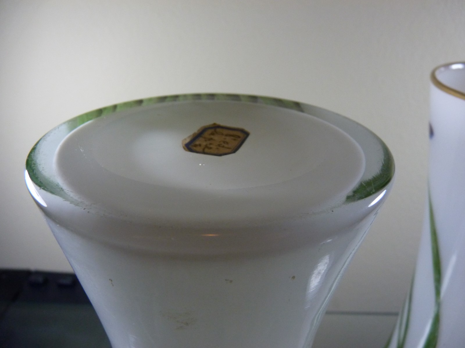 1015 -- opal cased with clear set of two large glass vases. True mirrored set. Hand enameled iris. 12"