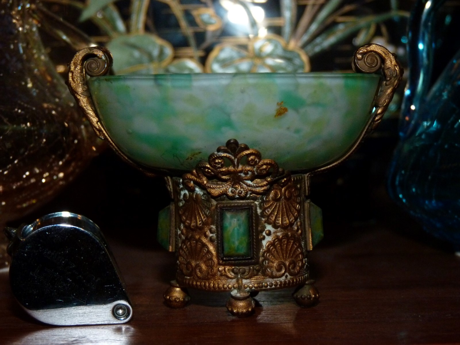 799 -- Mottled art glass salt in jeweled metal stand. French?