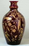 45 -- Oxblood, Harrach glass vase with enameled chrysanthemum and leaves in gilt.